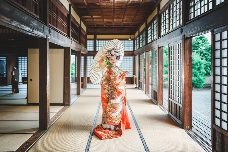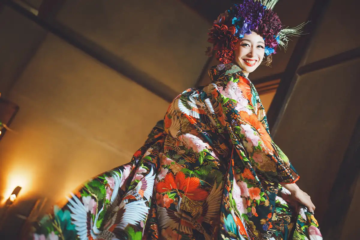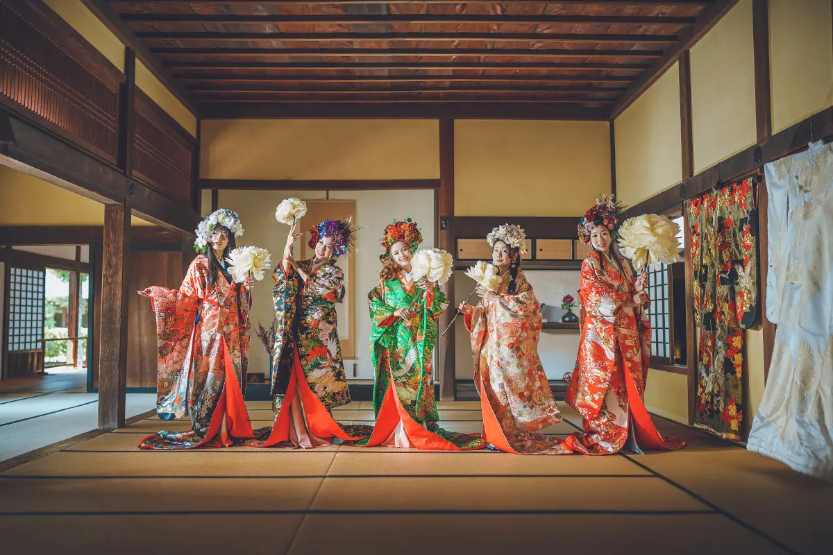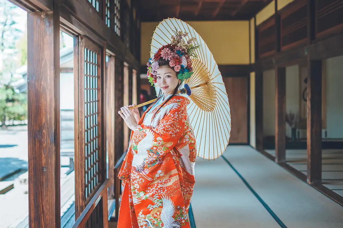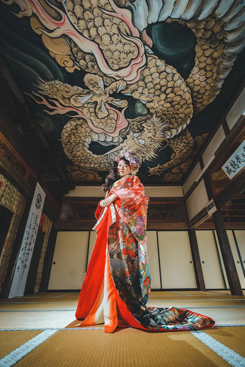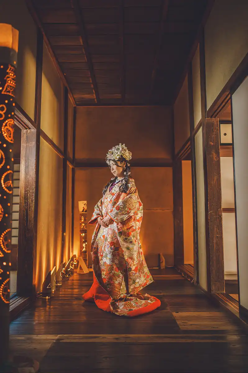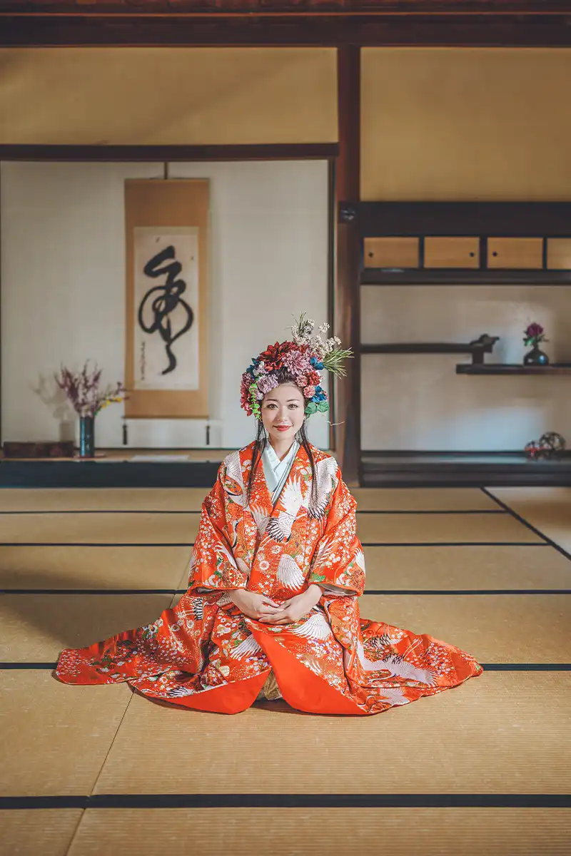 絢爛豪華な花飾り、色打掛、紋付袴、着付け、ロケ撮影、10カットのレタッチ済みデータまでオールインワンのフォトプラン。