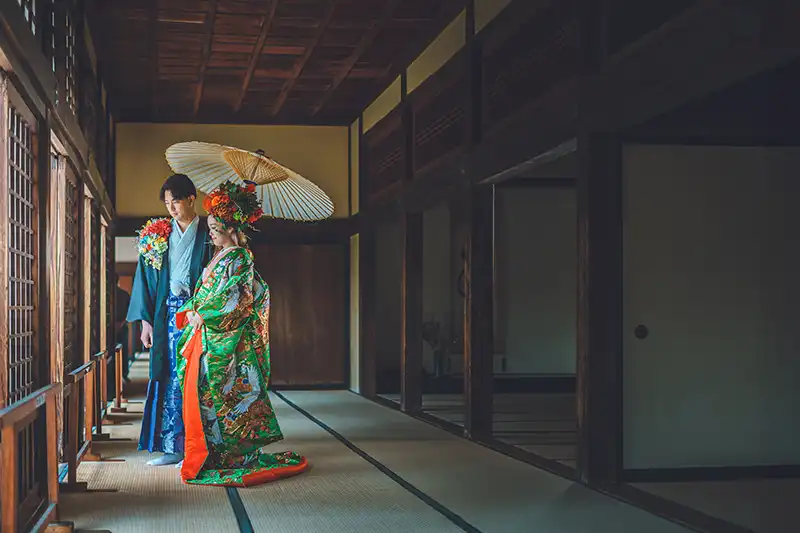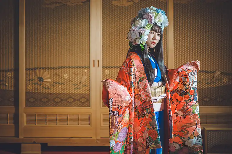 絢爛豪華な花飾り、色打掛、紋付袴、着付け、ロケ撮影、10カットのレタッチ済みデータまでオールインワンのフォトプラン。