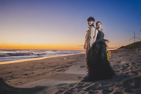 海岸ロケはかっこいい写真、可愛い写真、どちらも撮ることができます。打ち合わせの段階でおふたりのアイデアをお聞かせください。衣装、着付、メイク、ヘアセット、撮影代、全データまで全て入った安心フォトプラン。